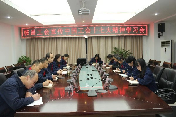 2018年11月15日下午,陜西核昌機(jī)電裝備有限公司工會(huì)在小會(huì)議室召開(kāi)傳達(dá)關(guān)于貫徹中國(guó)工會(huì)十七大精神學(xué)習(xí)的會(huì)議。核昌公司工會(huì)主席梁英平、副主席李榮、公司工會(huì)委員、干事、各分工會(huì)主...