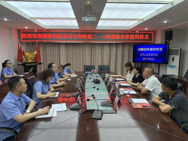 中陜核二一〇研究所總經理李偉,陜西鐵集能源有限公司張敏分別代表雙方簽署戰略合作協議。
