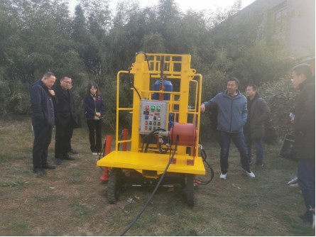 首先,參觀了電液一體化螺旋地錨設備,項目組詳細介紹了改進部位、操作要領以及升級后的設備優勢,并現場進行了遙控操作、轉向移動、地錨打孔等演示。